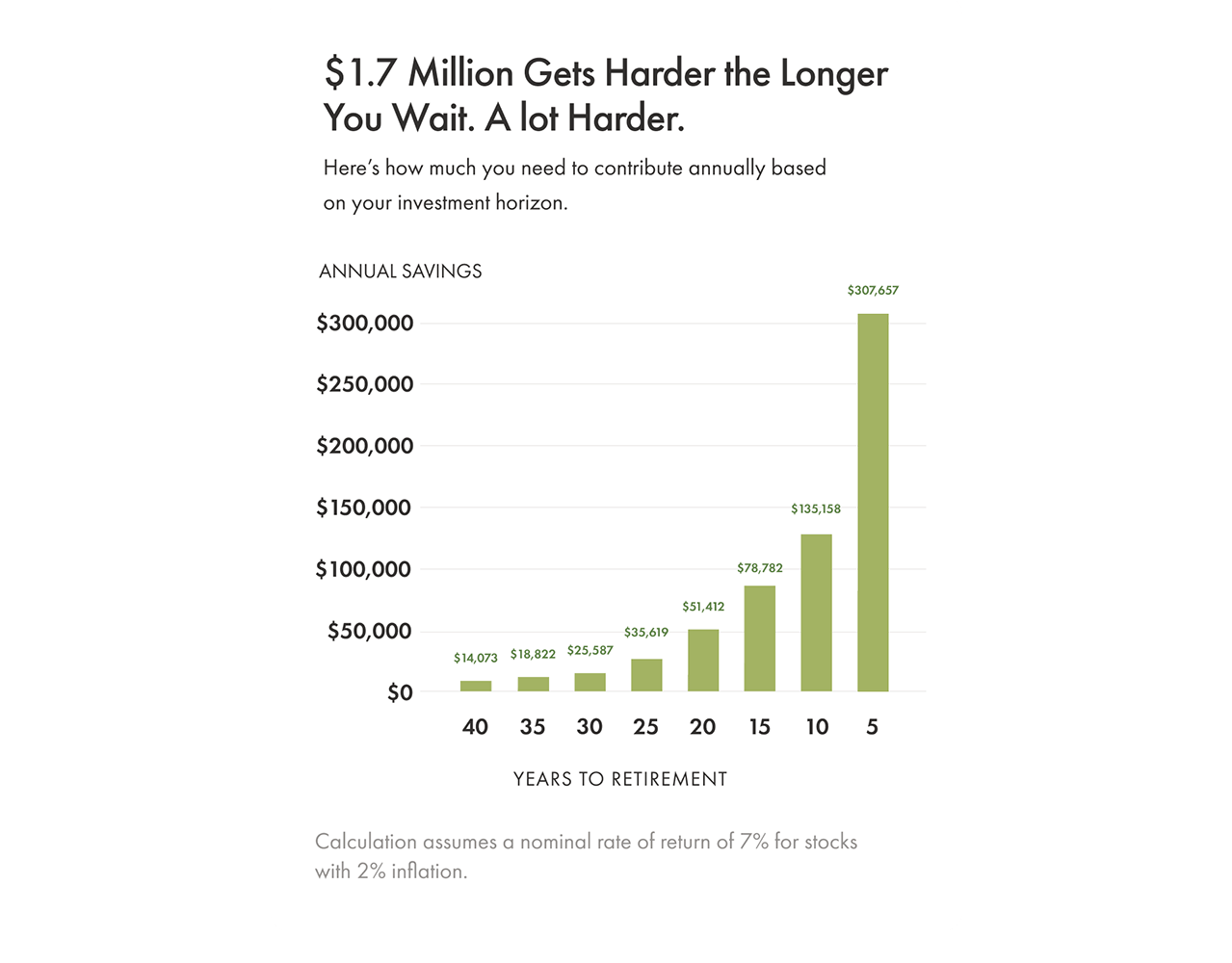OK, so what if you’re not 30, as the first chart assumes? And what if you don’t have any savings, much less $52,000? How can you reach $1.7 million then? The answer hinges largely on time. If you’re 25, the power of compounding returns is definitely on your side: if you want to retire at age 65, an annual $14,073 contribution over the next 40 years should get you to $1.7 million. (Congrats!) With every year you put off investing, though, your goal gets a lot more, let’s say, ambitious.