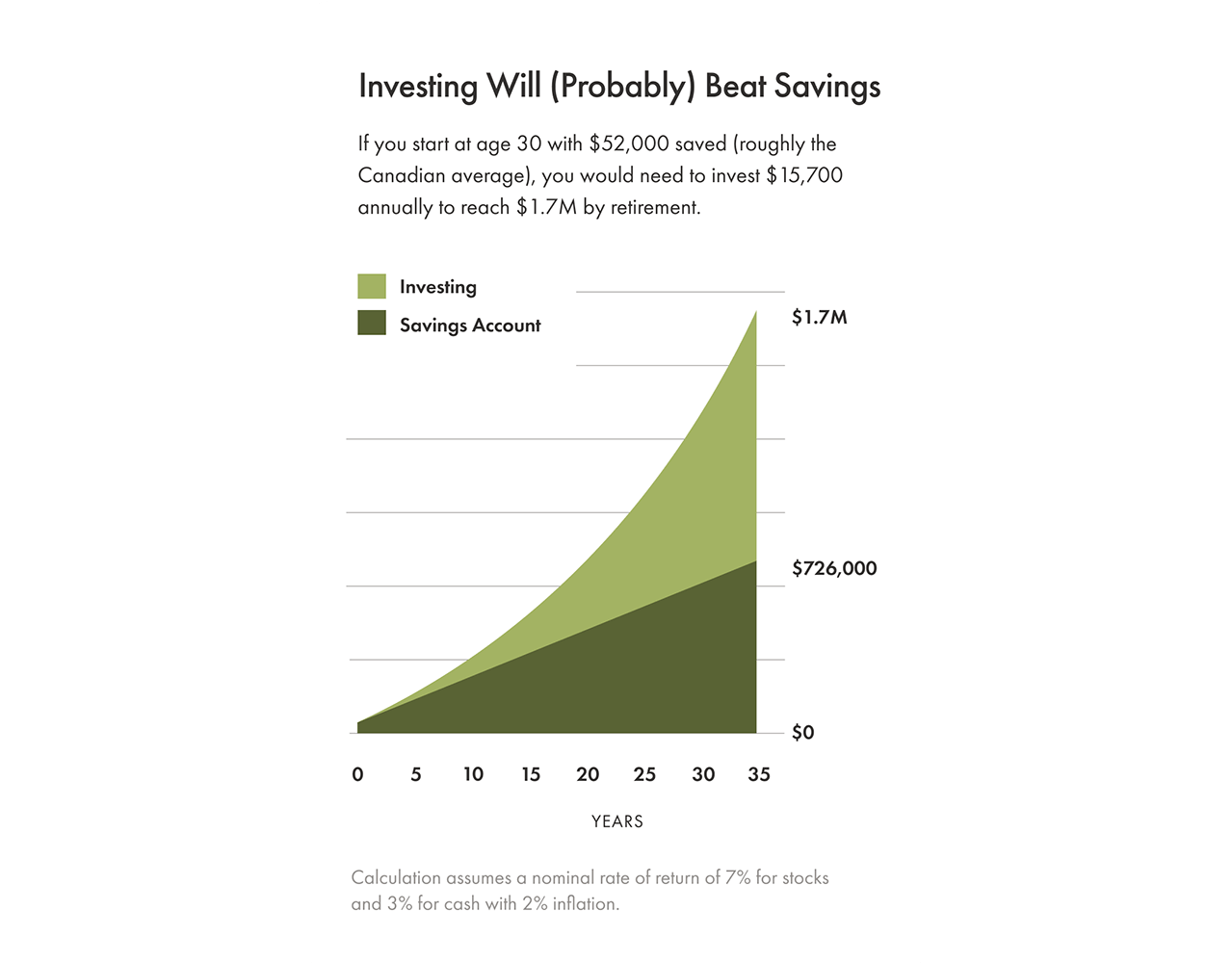 If you want to sock away enough money for retirement, investing, rather than sticking your cash in a savings account, is probably the way to go. That’s because, though no future outcome is certain, the stock market has historically grown 7% a year on average, while high-interest savings accounts tend to return 3%. So, going back to our $1.7 million benchmark: you could reach it by contributing $15,700 into a retirement account each year. We calculated that based on a 35-year investment horizon, since that’s how long folks in their early 30s have; we also assumed a $52,000 savings baseline, since that’s about average for that age group. Don’t get us wrong: $15,700 is a lot.* But it’s a lot less than the $31,560 you’d need to contribute annually to hit $1.7 million if you kept all your money in a savings account.** And, as the chart shows, if you saved, rather than invested, $15,700/year, you’d retire with $726,000 — a million short of your goal. No dice.