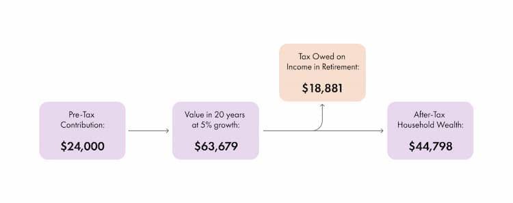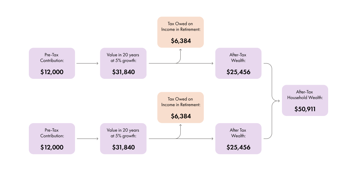 Imagine a couple with two partners. Partner A makes $134,000 per year, has a marginal tax rate of 43.41%, and expects that tax rate to drop to 29.65% in retirement. Partner B makes $40,000 per year and pays a marginal rate of 20.05%, which they expect to stay consistent in retirement.