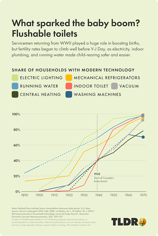 Idea #6: Can technological progress help reverse the baby bust? Writer/podcaster/Abundance guy Derek Thompson challenges the notion that the mid-century baby boom resulted from servicemen returning home from the Second World War, falling in love, getting good jobs in the postwar economy, and then using government programs to secure affordable homes in which to raise a family. Thompson argues that, in truth, the war’s end was only part of the equation and that the true catalyst was advances in medicine and consumer technology (refrigerators, washing machines) that made parenting easier. According to government data, the baby boom actually began in the late 1930s, long before WWII was decided, when the adoption of home appliances began en masse. Today fertility rates are collapsing worldwide, and Thompson wonders if technology (e.g., better IVF or egg retrieval) could help spark another birth bonanza. —J.S.