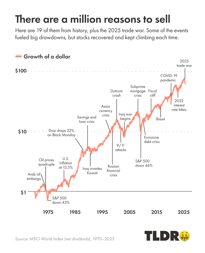OK, so what should you, dear TLDR reader, do about all this tariff upheaval? Well, the past few weeks have driven home the chestnut that there’s always a scary reason to sell — but that doesn’t necessarily mean you should. It’s not every day that a U.S. president attempts to reorder global trade and sparks a stock sell-off in the process, but periodic retreats do come with investing. Between 1973 and 2024, the TSX had 15 bear markets, or 20% drops. (Globally, there were eight bear markets.) Each of these drops no doubt felt like the end of the world for those who lived through them. And yet each time, stocks, broadly speaking, recovered and kept marching up and up. That’s why seasoned investors say that, as a rule, if your portfolio is diversified, you’re likely best off if you stick to your investing plan in good times or bad and keep putting money into markets at a regular clip.