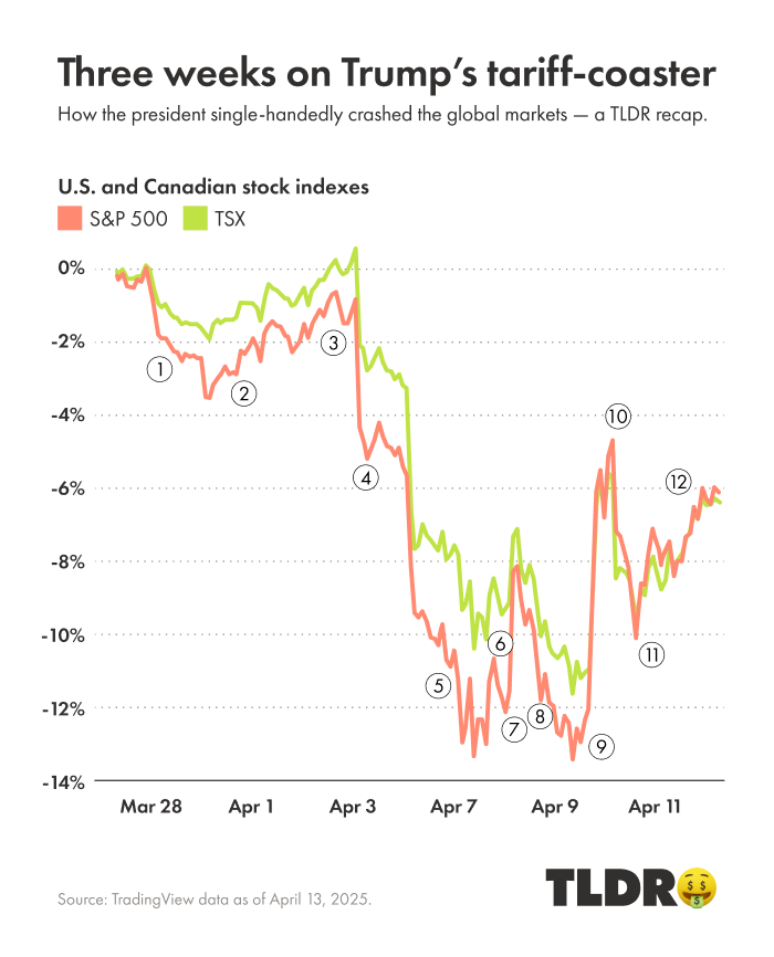 [4] On April 3, the stock markets plunge, kicking off one of the worst crashes since the Second World War. Over two days, the S&P 500 sinks by 10.5% and the TSX falls by almost as much. China strikes back with a 34% counter-tariff, and the week ends with trillions wiped out.