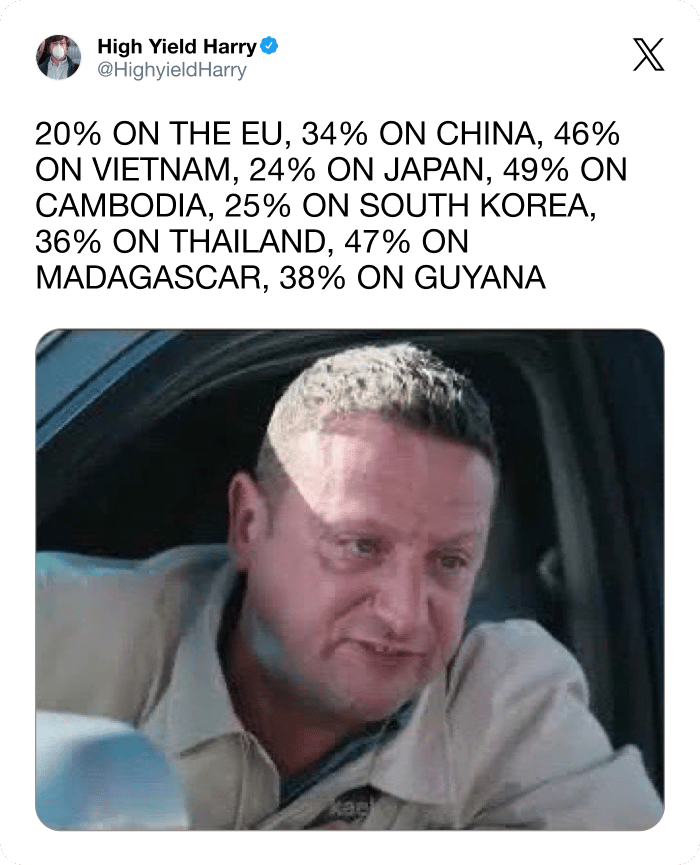 [3] Liberation Day! Trump is very much not bluffing, and he’s got the poster board to prove it. Under his plan, the U.S.’s effective tariff rate is set to reach its highest level in a century. The tariffs on China are ultra high, at 54%, and sure to slow down global trade. One CEO curses out loud during an earnings call as he watches his company’s stock tank in real time.