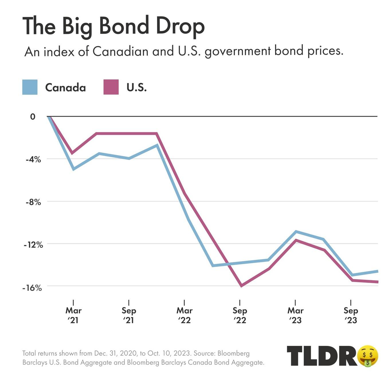 Why are people worried? Falling bond prices can pose a problem for small- and midsize banks, which tend to hold a lot of bonds, believing they’re pretty safe. But when prices fall, they can become insolvent — Silicon Valley Bank lost something like US$21 billion from falling bond values. Meanwhile, anyone issuing a new long-term bond now has to offer a high rate of interest on it, which makes it harder for businesses and governments to borrow money, which slows down the economy. Also, there’s the basic problem that if you’re trying to sell parts of your portfolio for retirement or to make a major purchase, the bond portion of your holdings is worth less right now.