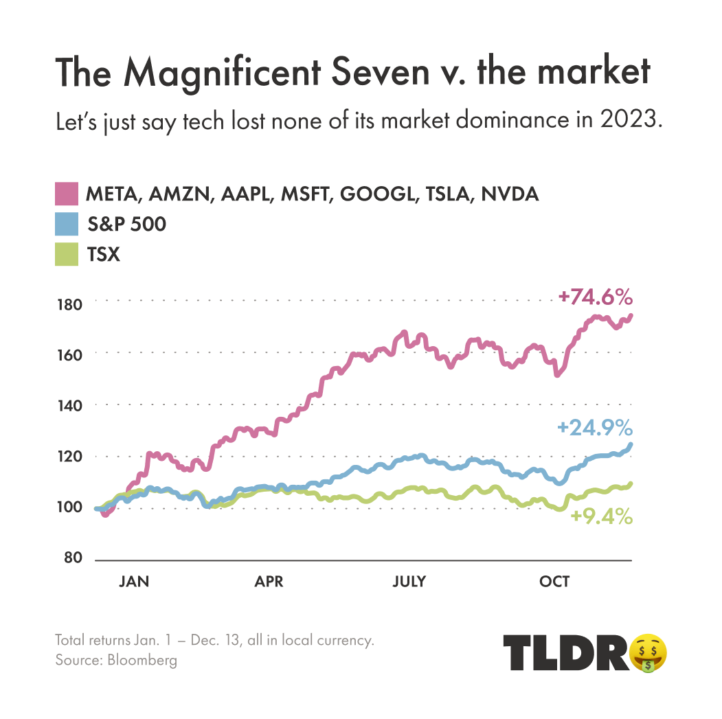 But a five-alarm economic crisis never materialized, or at least it hasn’t yet. Canada’s inflation rate fell from 5.9% in January to 3.1% in November. Unemployment remains fairly low, at 5.78%, despite 10 (!) interest-rate hikes since 2022. Consumer spending is at an all-time high. And stocks have rallied as more and more investors have come to see sunshine and rainbows in the future, based on the assumption that central bankers will cut rates next year. In other words, it looks like we’re getting a soft landing.