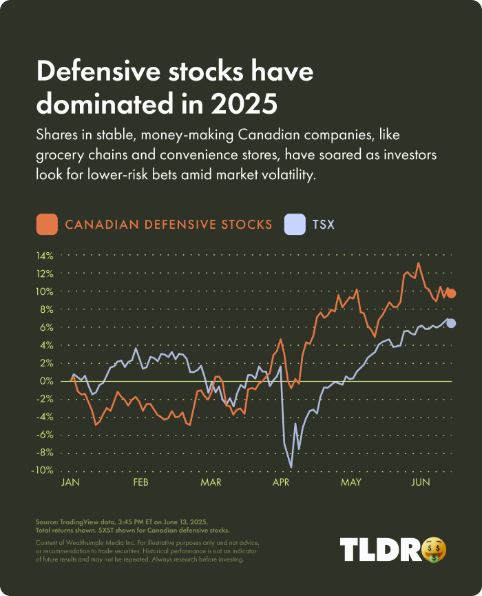 In case this is your very first time reading about markets in 2025 — news flash! — stocks have been bouncing around a lot. After cratering in April, the TSX is back up 6.4% for the year, with the S&P 500 lagging behind at only 1.8%. The tariff-related volatility has sparked a lot of chatter, both in fancy business papers and on Reddit, about so-called “defensive” stocks, which refers to shares in boring, stable companies that generate a lot of cash. We decided to examine whether the buzz is warranted.