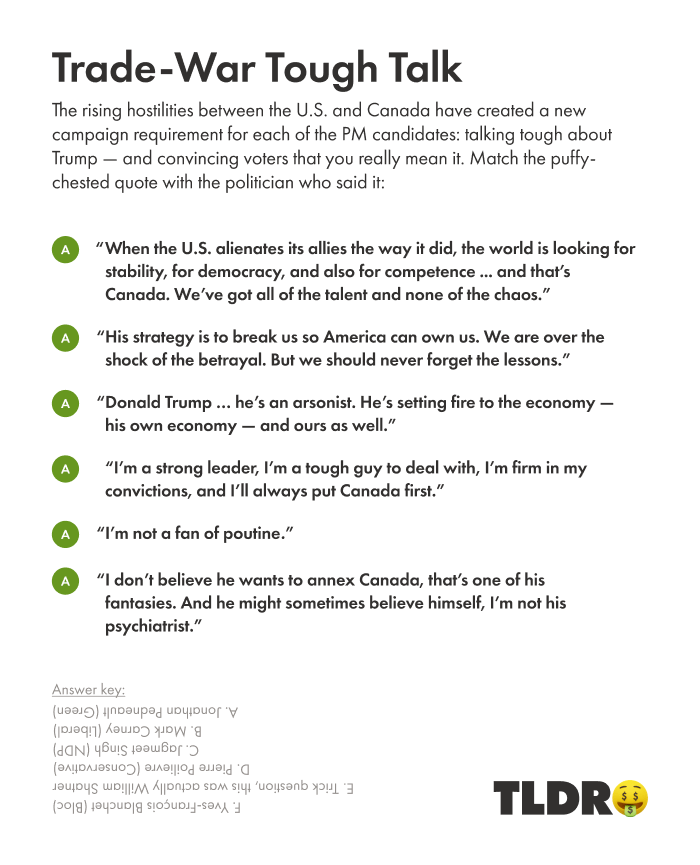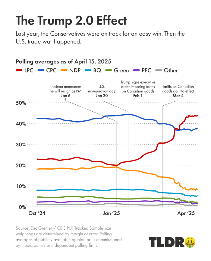 Why is Canada’s favourite (we are your favourite, right?) financial outlet devoting a full feature to … politics? Well, consider the state of this election — consider the state of Canada. Just a few months ago, the main issue on Canadians’ minds was the housing crisis, and the incumbent Liberals looked bound for a bruising election. Then: plummeting stock markets. A global trade war. Trump blustering about annexing Canada by force. Thanks to all this drama, the election has shaped up far differently than any of us guessed. And though it’s a cliché that every election is about the economy — well, this one is really about the economy.
