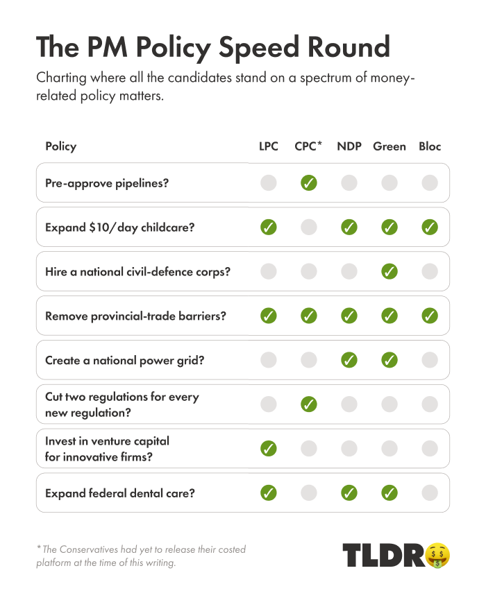 Now let’s talk about the issues. This time last year, federal politics centred almost entirely on housing. Now, readers tell us their worries have broadened. Below, we’ve rounded up the top pledges each party has made to address some of Canada’s biggest financial concerns. Many parties share similar positions — like wanting to provide additional funds for apprenticeship training, and to upgrade highways and railways for trade — so we tried to highlight novel ideas each group is promoting.