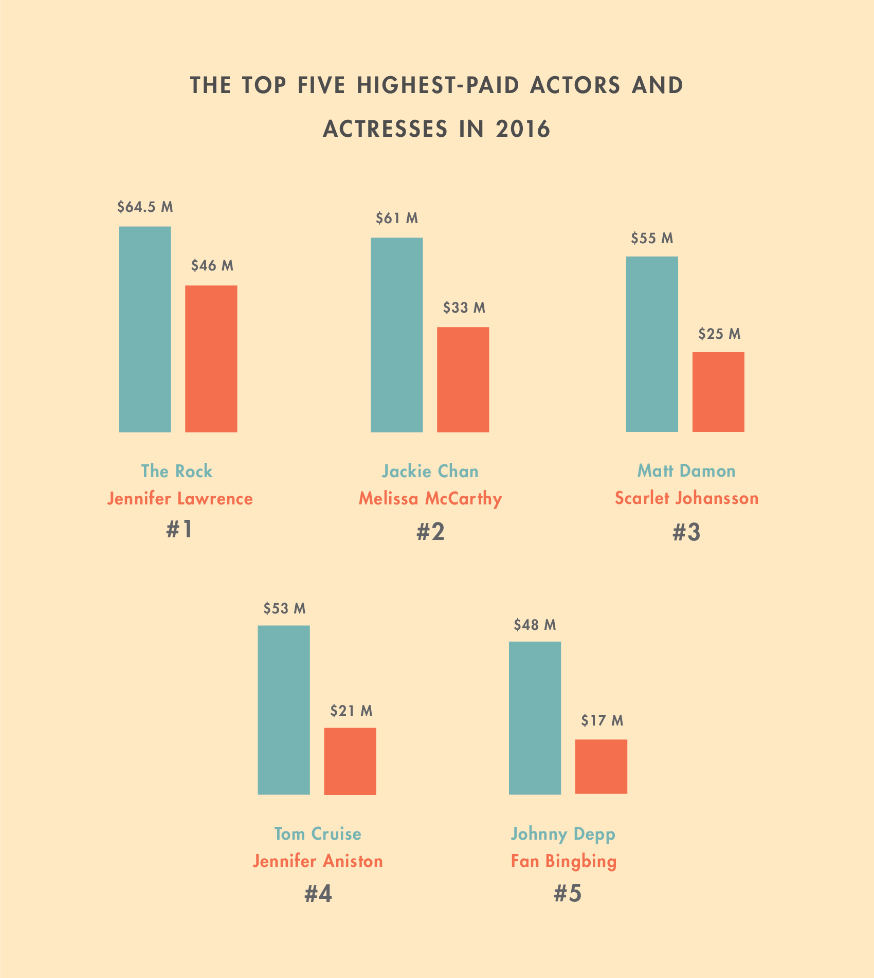 In 2016, women working as actors made, on average, 87% as much as their male counterparts, placing actresses squarely in the middle of the pay-gap spectrum. In the upper echelons of the industry, however, the gap was more dramatic: The top ten highest-paid actresses earned, on average, 42 cents for every dollar earned by their male counterparts. And the top five, as you can see below, earned 48 cents for every dollar earned by the top five male actors.