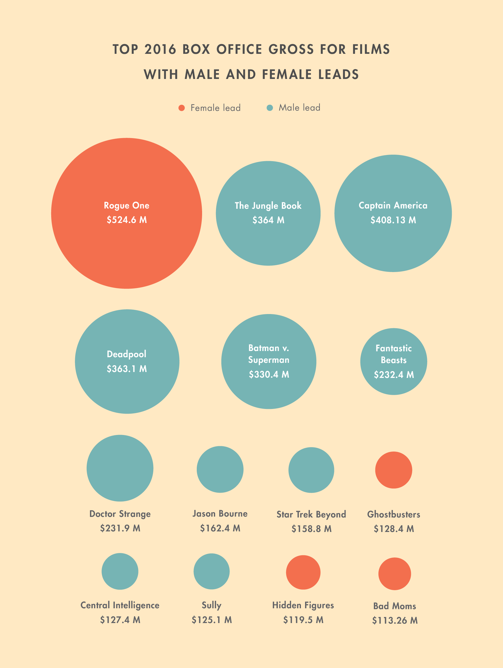 It’s easy to shake a fist at studio executives for perpetuating a culture in which actors are caviar and actresses are…kielbasa? (Just as good but way cheaper.) But the truth is that movies with male leads tend to have higher box-office grosses—with some exceptions. Rogue One, for example, cracked $1 billion in global box office and crushed the next-highest-grossing film, Captain America: Civil War. After Rogue One, though, the next eight highest-grossing films star men: