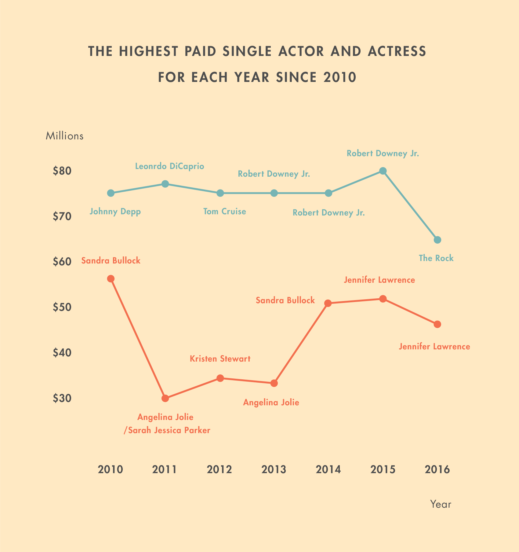 If you measure the relative size of the earnings of the top female and male earner in a given year in Hollywood, you’re going to get some wild swings. Franchises and ad deals come with multimillion-dollar bonuses, and one deal can change the average. But even with all those swings, over time the trend is clear: The top-earning actress makes, on average, 58% of what the top-earning male actor brings in—even with Jennifer Lawrence and Sandra Bullock approaching, at moments, parity with The Rock and Johnny Depp, respectively.