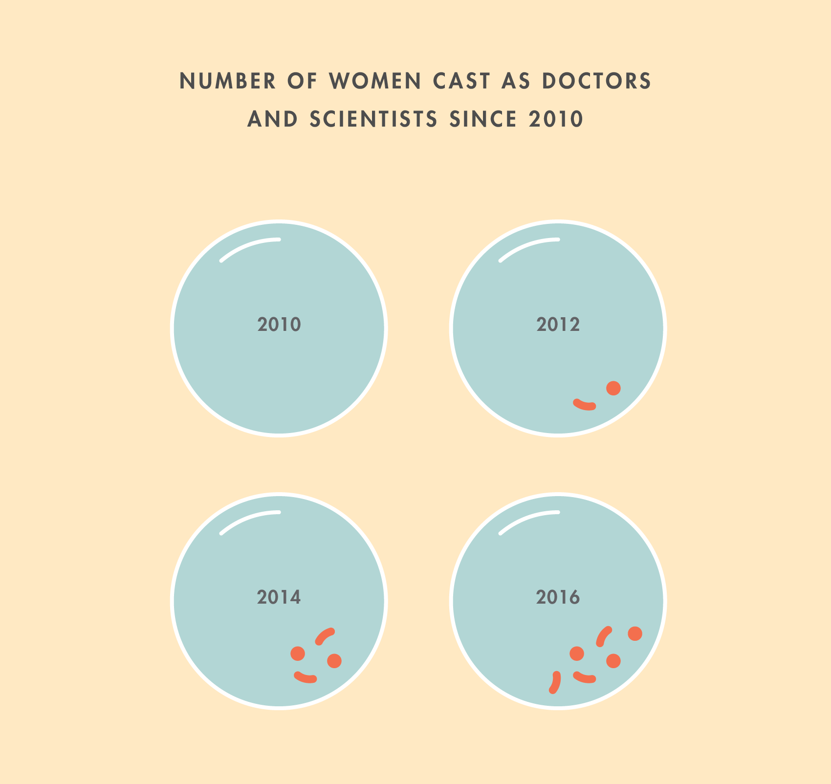 Historically, the professions of female characters in films have mirrored those of contestants on The Bachelor (“free spirit” and “dog lover”—those were actual jobs listed by contestants on that show, by the way). Lately, though, we’ve seen a marked increase in women playing doctors and scientists. In the top 30 films of 2010, only one doctor role was played by a woman. In 2016, women played almost as many doctors as men did: