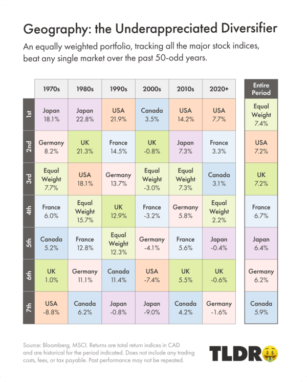 [2] Buy different assets, in different places. A big way to both mitigate risk and avoid missing out on good returns is to bet on assets that are geographically diversified. For instance, as the table below shows, U.S., Japanese, and Canadian stocks each dominated different decades over the past 50-odd years, but a portfolio tracking all the world’s major stock markets (“Equal Weight”) performed better than any one market — a big feather in diversification’s cap.