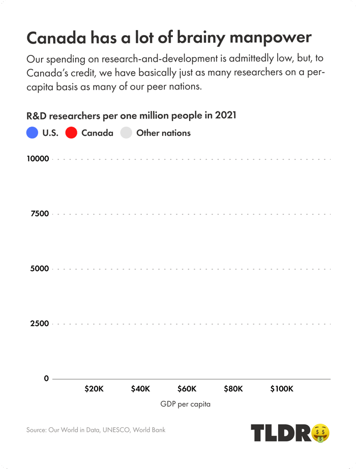 There’s no denying that Canada’s R&D spending falls well short of other countries’. But, as you can see here, we have a solid number of researchers relative to our population size; they’re just underfunded. Also, for what it’s worth, last year five U.S. tech giants together spent US$229 billion on R&D, which is roughly a third of the U.S. total, so it’s no wonder America’s R&D spending is high.