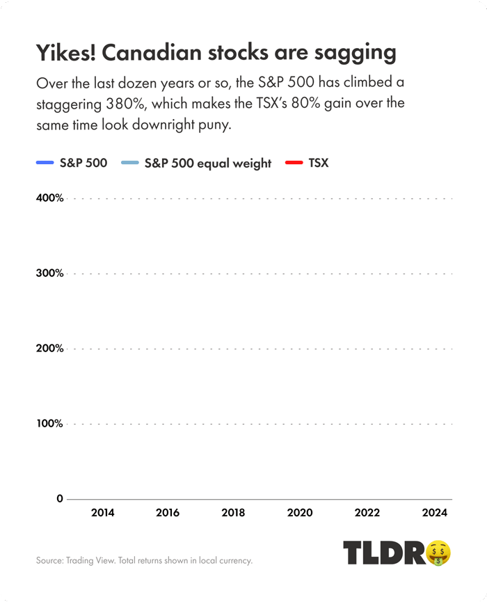 Another ominous sign: the TSX has way underperformed the S&P 500. A few huge tech companies have done much to lift U.S. markets. But the light blue line shows that even if the S&P 500 were equally weighted to dampen the effect of these giants, American stocks would still trounce the TSX. Point being: U.S. companies have, generally speaking, dominated Canadian ones.