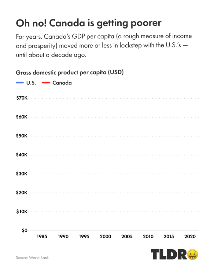 The U.S.’s overperformance basically comes down to one thing: big tech. Five large companies are responsible for half of the S&P 500’s gains this year. Who cares? Well, so much foreign money has flowed into the States to invest in these tech giants that the U.S. dollar is extra swole as a result. And — this is wonky but important — a strong greenback partly explains why the U.S. has pulled away from its peers. Want proof? Just put GDP per capita into local currency, not USD, as we did above. When you do that, you’ll see that Canada has stayed in line with the U.S. In other words, our incomes have risen just as much as our neighbours’ in our respective countries.
