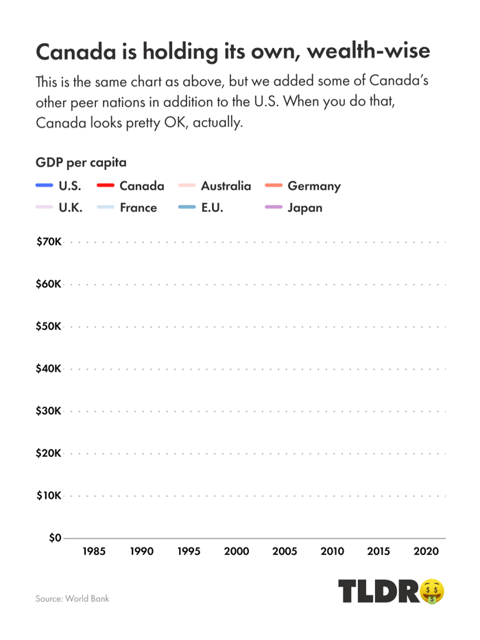 This chart turns the doom-and-gloom narrative on its head: Canada’s GDP per capita looks fine when you compare it to other rich nations’. The U.S. has just pulled way ahead of the pack.