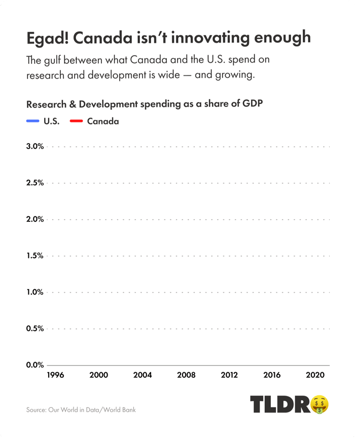 As if Canada wasn’t already lagging badly enough, we’re setting ourselves up for future meh results by investing significantly less in research and development (R&D) than the U.S. That means our companies, government laboratories, and research firms likely lack the resources to make breakthroughs that could generate wealth for Canada.
