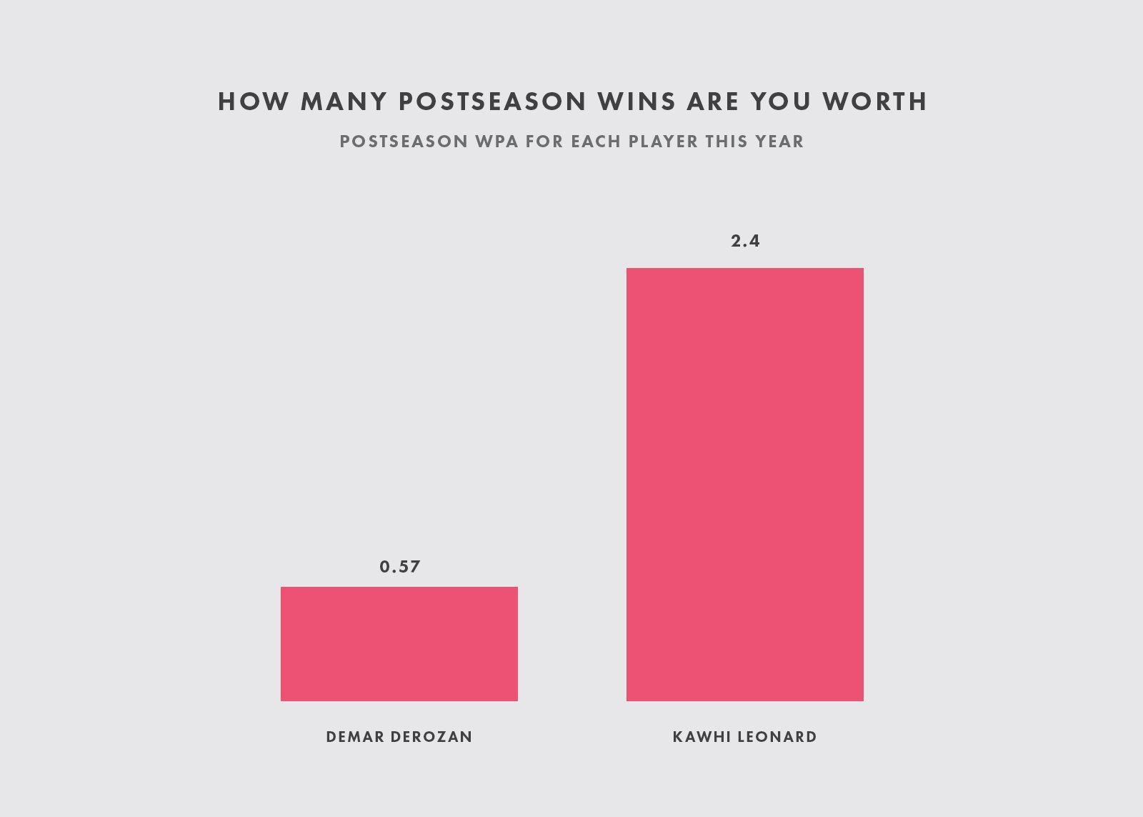 Kawhi’s game-winning hoop, for example, was worth 0.389 WPA alone. If he hadn't made it, the Raptors' chance of winning the game (and the series) would have been almost 40% lower.