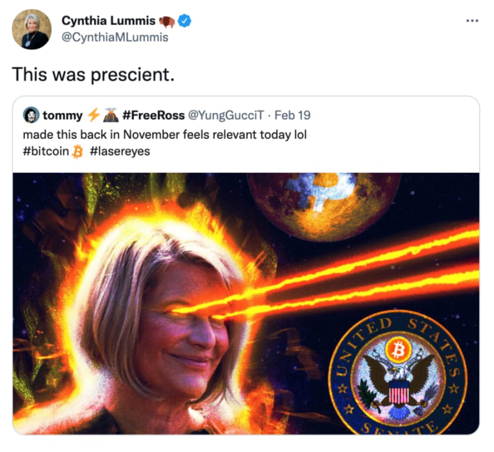 The campaign launched on February 16. It grained traction fast. Adoptees would come to include Elon Musk, Paris Hilton, and Sean Hannity. A Dutch Libertarian Party candidate went laser on a billboard. Ohio Congressman Warren Davidson gained laser eyes, and so did Cynthia M. Lummis, the junior Senator from Wyoming, whose office put out a statement explaining why: “Sen. Lummis is a big supporter of digital assets and financial innovation, and the laser eyes are showing that support.”