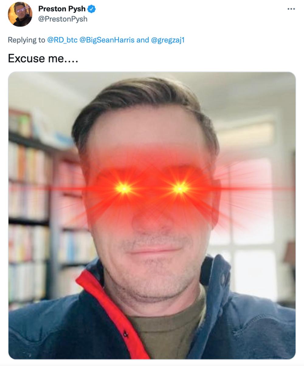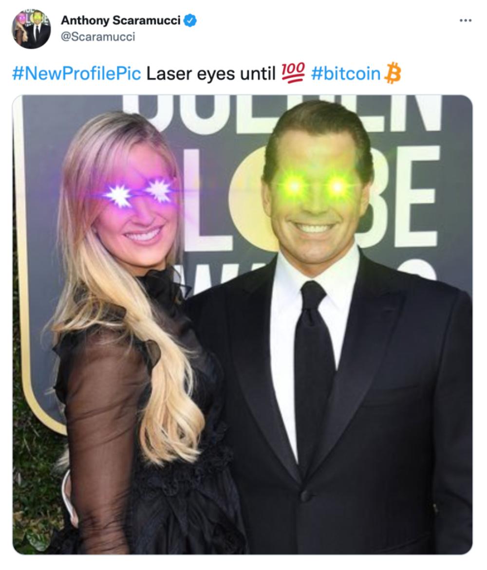 “The purpose of laser eyes was to get you to talk about laser eyes, and therefore talk about Bitcoin,” Lammer said. “That means the laser eyes have succeeded. If you think it’s a little culty, I don’t think people are worried about that. It’s like NFT trading. There are people trading JPGs on the internet right now for hundreds of thousands of dollars. There’s no way to do that without people thinking you’re ridiculous. There’s no JPG you can trade where people are going to say, Oh that’s appropriate. But the mistaken idea is that the people who are trading the JPGs care very much what other people think about them.”