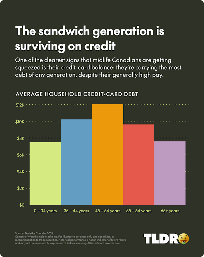Thanks to all these costs, Canadians aged 40 to 54 have endured the biggest jump in spending over the past dozen or so years, according to StatCan. They have by far the highest living expenses, at more than $141,000 annually per household. And they hold the highest household credit-card debt of any age group — an average of $12,000 — even though middle age is when wages typically peak.
