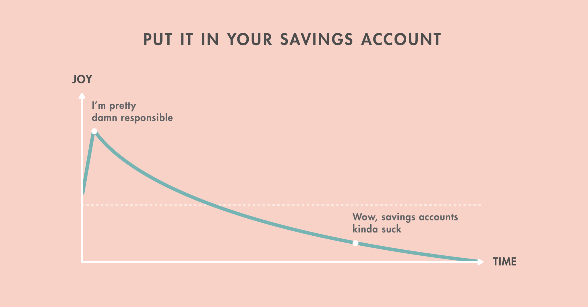 You’ll feel a rush of joy after that deposit — “Look at that, it’s all there. I didn’t use it to buy a collection of hoverboards!” But then you start to see what your peers are earning by investing their money in (you knew we were going to say it) low-fee, optimized growth portfolios with an average rate of return of 6% annually. Suddenly 1% (that's about as well as you could do in a high yield savings account right now) won't feel so hot. Your joy level will drop another 15 microsmiles (we made up that measurement) when you realize that, since inflation is about 2%, you'll actually be losing money by keeping it in a “high-interest” savings account.