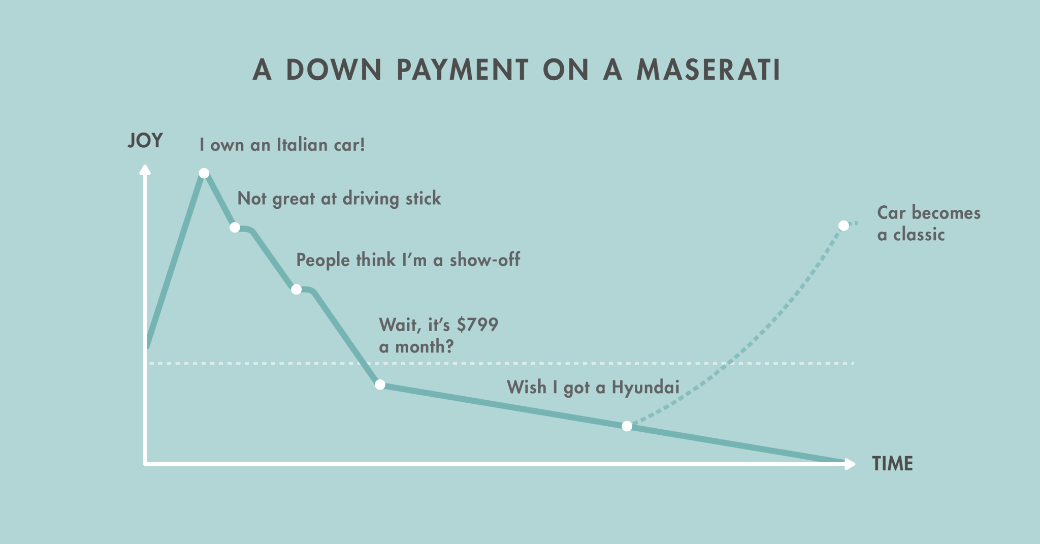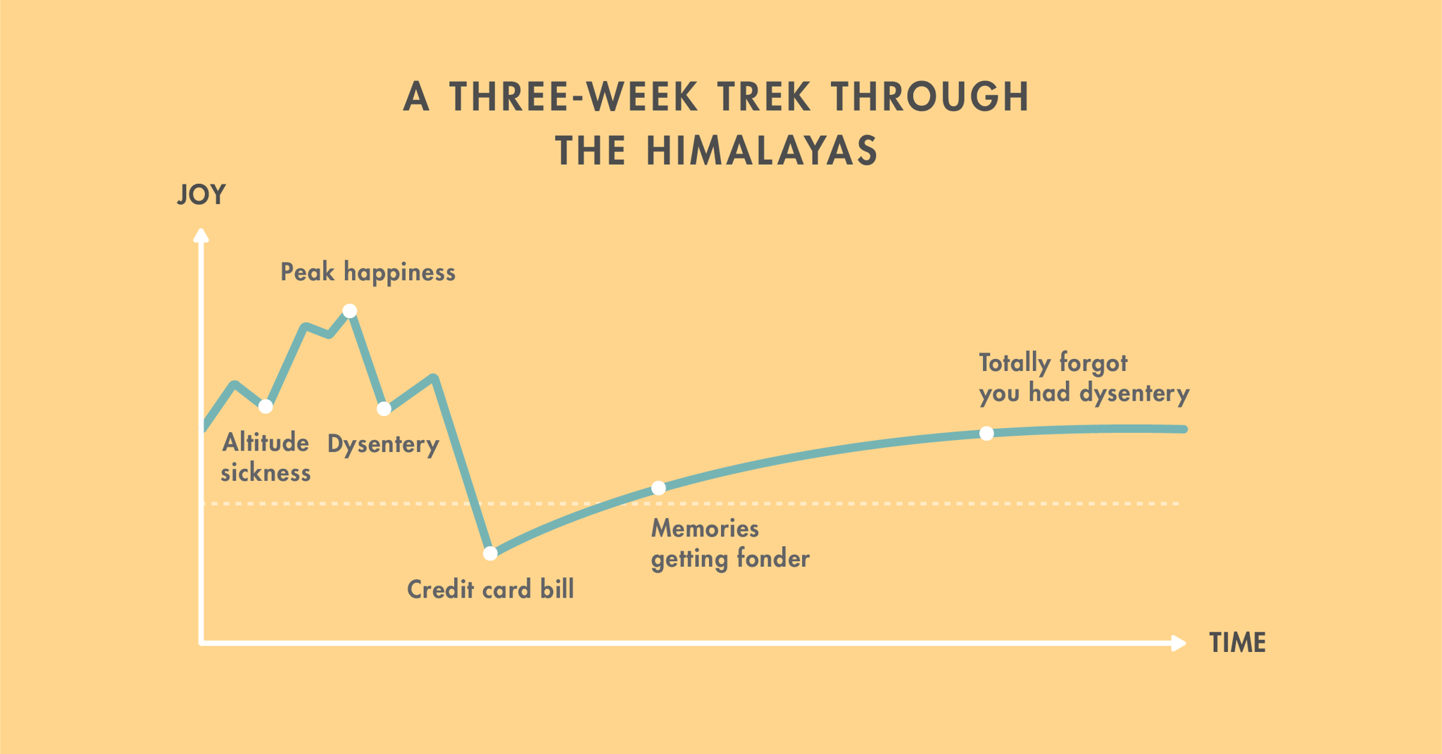 Trip of a lifetime. We're not going to argue with that. You're not going to be 86 years old talking about that pair of Adidas Boosts you bought when you were 32 (you're not, right?). Maybe that initial case of altitude sickness might bury the enjoyment at the beginning. But when you make it up to the very top of the world? And get to hang out with a yak? That's a high joy-ometer. Which will plummet slightly when you get home and see your credit card bill. And later, you might feela twinge of regret when you realize you didn't max out your retirement account and catching up is harder than staying on pace. But still, for years and years you'll be kept good company by a long, easy-sloping y-axis of fond nostalgia.