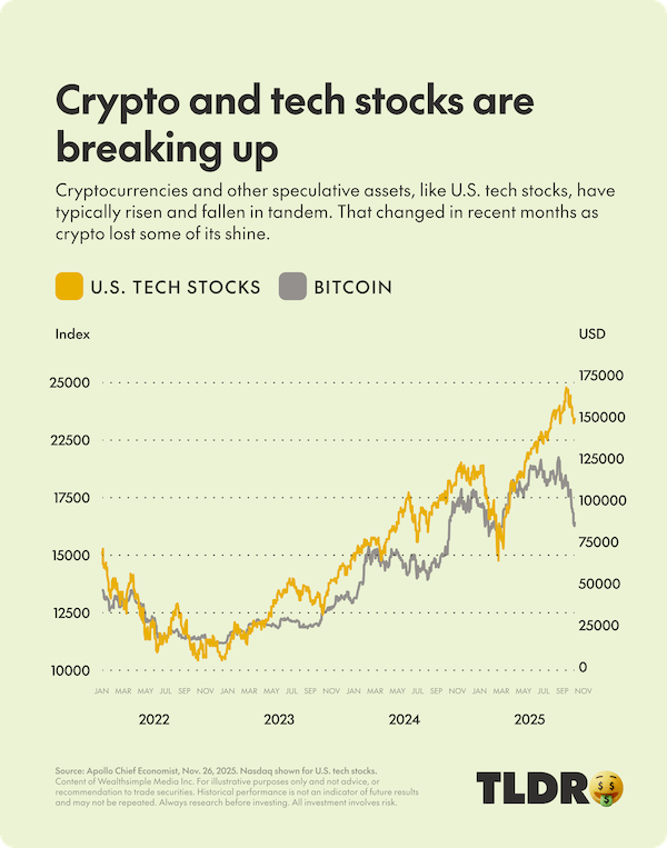 For much of Bitcoin’s brief history, it has generally traded in lockstep with other speculative investments, particularly U.S. tech stocks. At least that was true until this October, when it pulled a Robert Frost and took a different path: U.S. tech stocks are now up more than 20% on the year, while Bitcoin is down 5.6%. Wasn’t 2025 supposed to be the year crypto went legit? Didn’t noted curmudgeon Jamie Dimon, of JPMorgan Chase, finally come around on Bitcoin? Yes. But with the economy on both sides of the border looking a little shaky, some crypto whales have apparently decided the time is ripe to cash out.