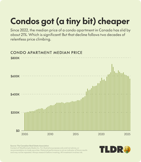 Canada’s high-rise condo perma-boom of the 2000s came to a halt in 2022, when interest rates shot up and demand collapsed. Since 2022, in fact, the total number of condo units sold in Toronto (the country’s biggest market) has declined 75%, meaning it’s effectively frozen. Prices across Canada have come down about 21%, prompting some media outlets to dub it a “condo crash,” which is a bit of a stretch. The drop is substantial, sure, but condo prices are still up 77% over the past decade — so units remain out of reach for many buyers.