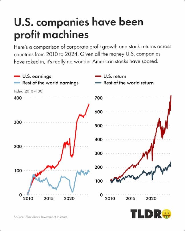 For every doomer, there’s an optimist who thinks U.S. stocks will keep ripping basically forever. Among them is banking giant UBS, which suspects that the U.S. is on the verge of another “roaring ’20s.” Investors who share such views argue that, yes, the price of U.S. stocks has soared, but U.S. companies have also grown their profits much than companies elsewhere. And because of that, stock valuations, though high, aren’t nearly as high as they were in 2020 or 2021 if you look at companies’ estimated future earnings (aka what really matters). In other words, U.S. stocks’ sky-high prices might be totally justifiable. As for the concentration concern, the non-Magnificent Seven companies in the S&P 500 — the Other 493, if you will — have recently been reporting increasing profits, so they might catch up.
