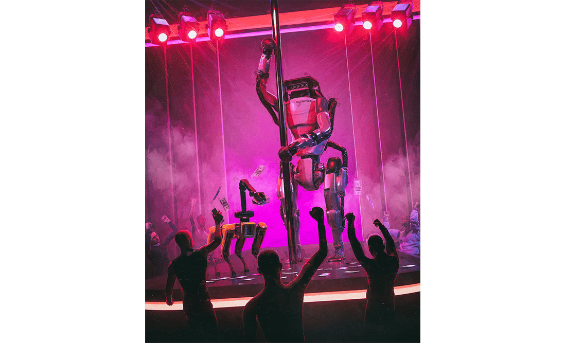 Then in 2003 I started doing web design at a small company in Wisconsin. I think I started at $37,000. And then I started drawing. I wanted to get better. And so I did that for a year and then I realized, "Hey, I still suck, but I got a lot better." And I had always wanted to learn a 3D program, so I was like, "Well, what if I did a render every day?" This is how the Everydays [daily drawings, photographs, or digital illustrations posted to Instagram and his personal website] started. I've kept up the Everydays, literally, every single day for the last 13 years. Those pictures are why I have 1.7 million followers on Instagram. I don't know if you saw that Boston Dynamics video with the dancing robots? So today’s Everyday was based on that thing, I had them stripping on a stripper pole. Nobody was doing it when I started but a shitload of people started doing Everydays because of me. I kind of started this Everydays movement in 3D graphics.