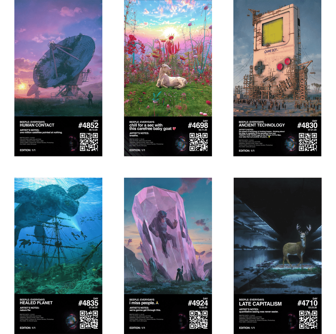 Then we did 20 one-of-one, single editions of my favourite Everydays and had 20 auctions throughout the weekend. The first one, it ended at $75,000, and then the second one went for $77,000 a half hour later. Then one went for $90,000, and the prices just kept going up. I was with my wife and kids over at my brother’s house, who got a white board out to keep track of the sales. I made a million dollars in one day just from these things. And so then the second day they started again, and it just kept fucking going up. There was another million dollars from those. The last auction was the complete 2020 collection, and it included all of the pieces in one very long video file. The way these auctions work is they go to the end of the allotted time but if somebody bids, it extends the time five minutes, and it can go on like that. And so the last piece looked like it was about to go for $380,000, and then at the absolute last second, this dude bid $777,000.