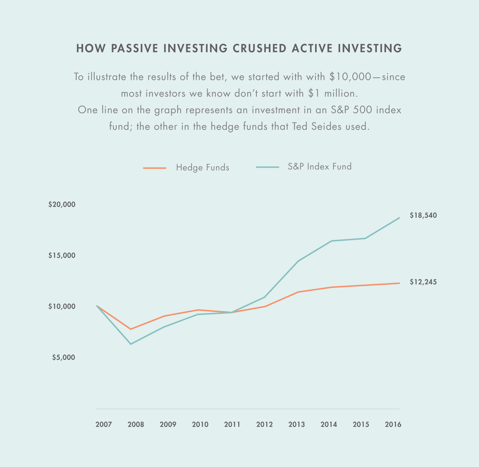 So he makes a wager. He saidthat a simple fund that tracks the S&P 500 would perform better than a hedge fund over the course of the next decade, and he’d bet a whole lot of money that he was right.So a hedge fund guy named Ted Seides took him up on it.