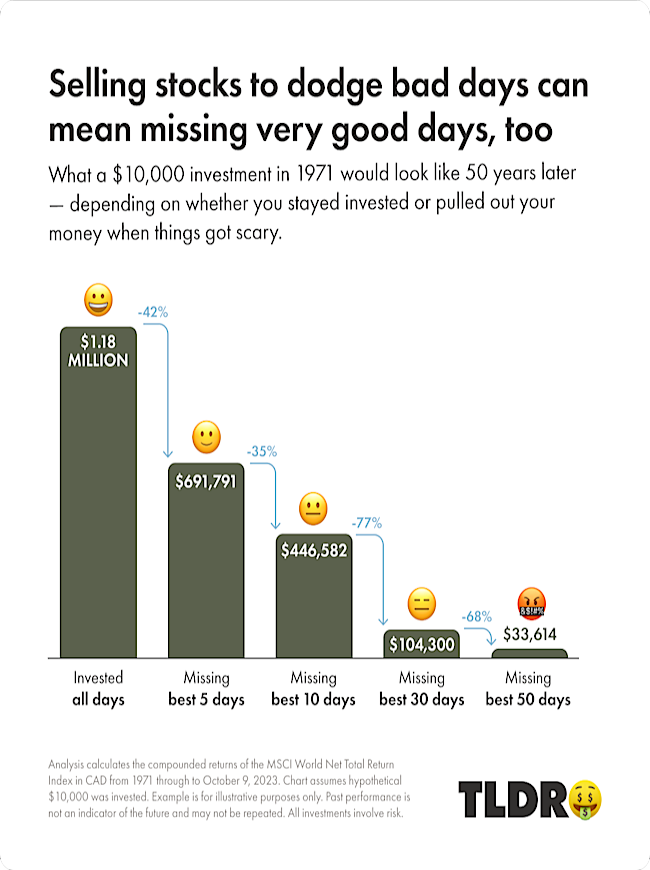 Everyone knows that the goal of investing is to buy low and sell high. So if the market’s bound to go down sooner rather than later, why not liquidate your investments, and after the inevitable downturn happens, snap up all those bargain-priced stocks? You may be smart. (You found us, after all.) But, no offense, you’re probably not smart enough to perfectly time the stock market. Why? Because no one is really that smart. Not even Warren Buffett, who likes to remind smart investors to stay the course, and stay invested, despite any market fluctuations. Research shows that trying to time the market more often than not leads to worse returns. Similarly, indicators show that extremely negative investor sentiment precedes higher returns on average. Meaning: a lot of investors should stop trying to trust their guts. The steady-as-she-goes investment strategy beats pretty much everything else. One big risk of selling your stocks and trying to time your reentry is that no one knows when things will turn around and prices will surge big. Stock gains aren’t evenly distributed, and history suggests that if you miss one of market’s best days, your portfolio will suffer.