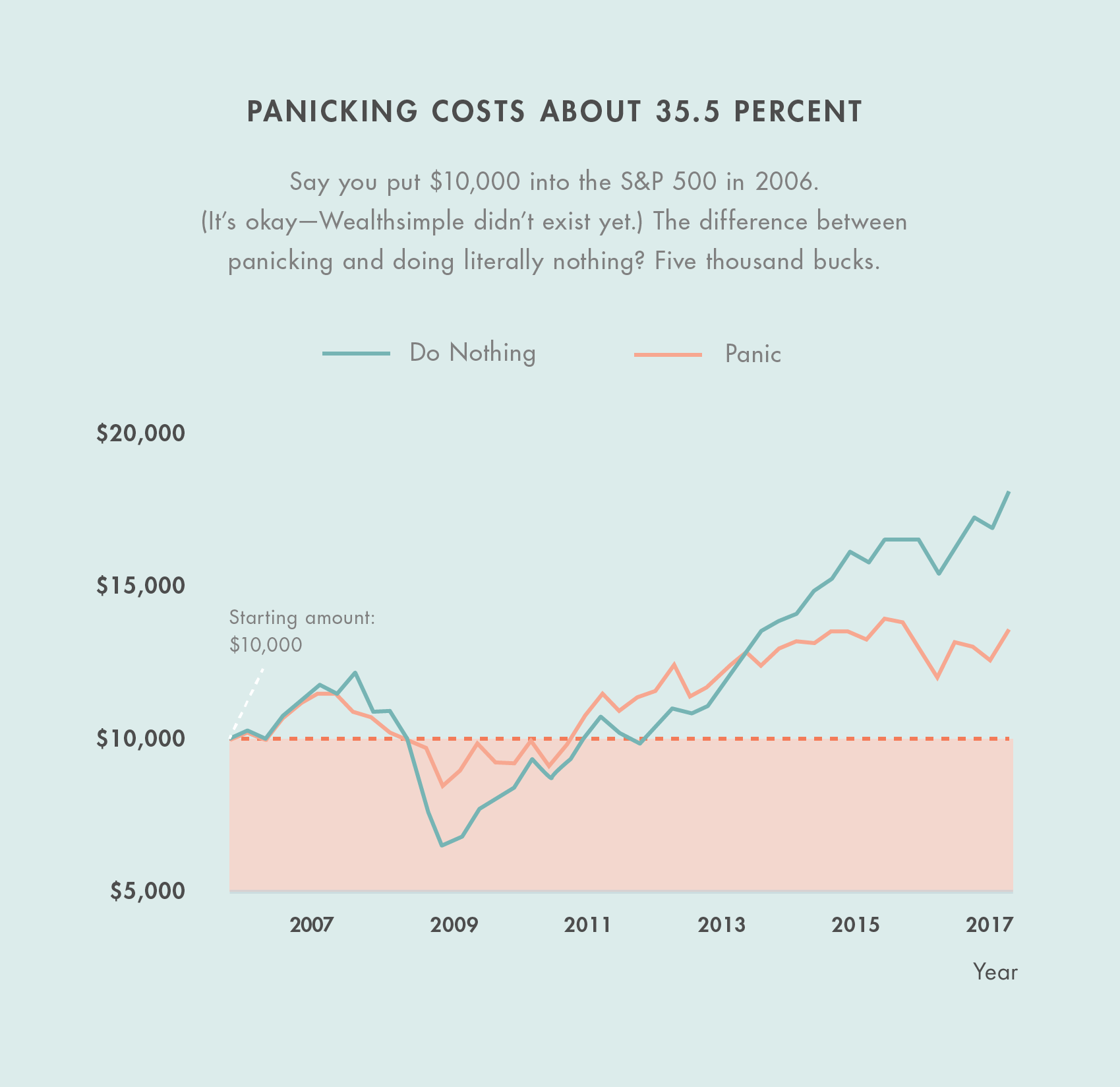 Don’t believe us? The below chart shows what would happen if you’d invested using one of two scenarios. (We made the chart back in 2017, but what it illustrates is still relevant, so stick with us.) In the first, you do nothing. In the second, you employ what’s been called a panic-selling strategy — sell everything when the market drops more than 2% in a day, and then buy back 20 days later if things are looking flat or better. It turns out the guy who lost the password to his brokerage account would have done better. By a lot. And that’s not including transaction fees.