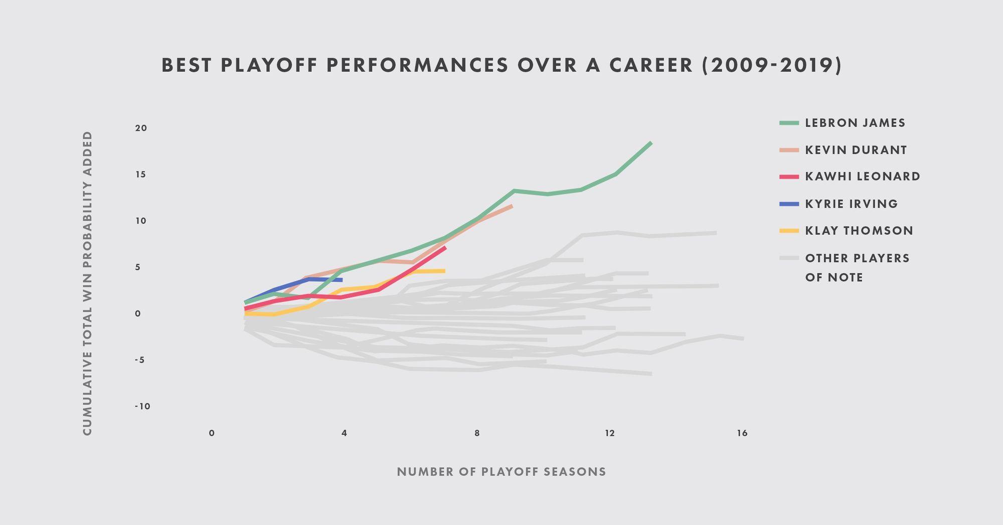 This graph shows playoff WPA from year to year. See all those black lines? Those are all the players in the NBA except Kawhi, Kyrie, Klay, Kevin Durant and Lebron James. We graphed it like that because, over the course of his career, Kawhi is beating everyone except LeBron and Durant.