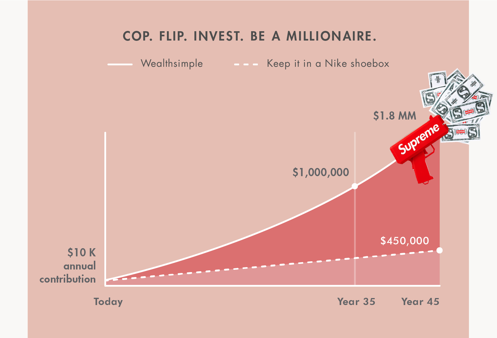 And we got to thinking: Supreme is a fascinating economy. And because we are first and foremost data and finance nerds (except for Pawel, who besides being a data guy is also a streetwear aficionado), we set a challenge for ourselves. If we used the power of Wealthsimple's passive investing platform, could reselling Supreme make you a millionaire before you're sixty?