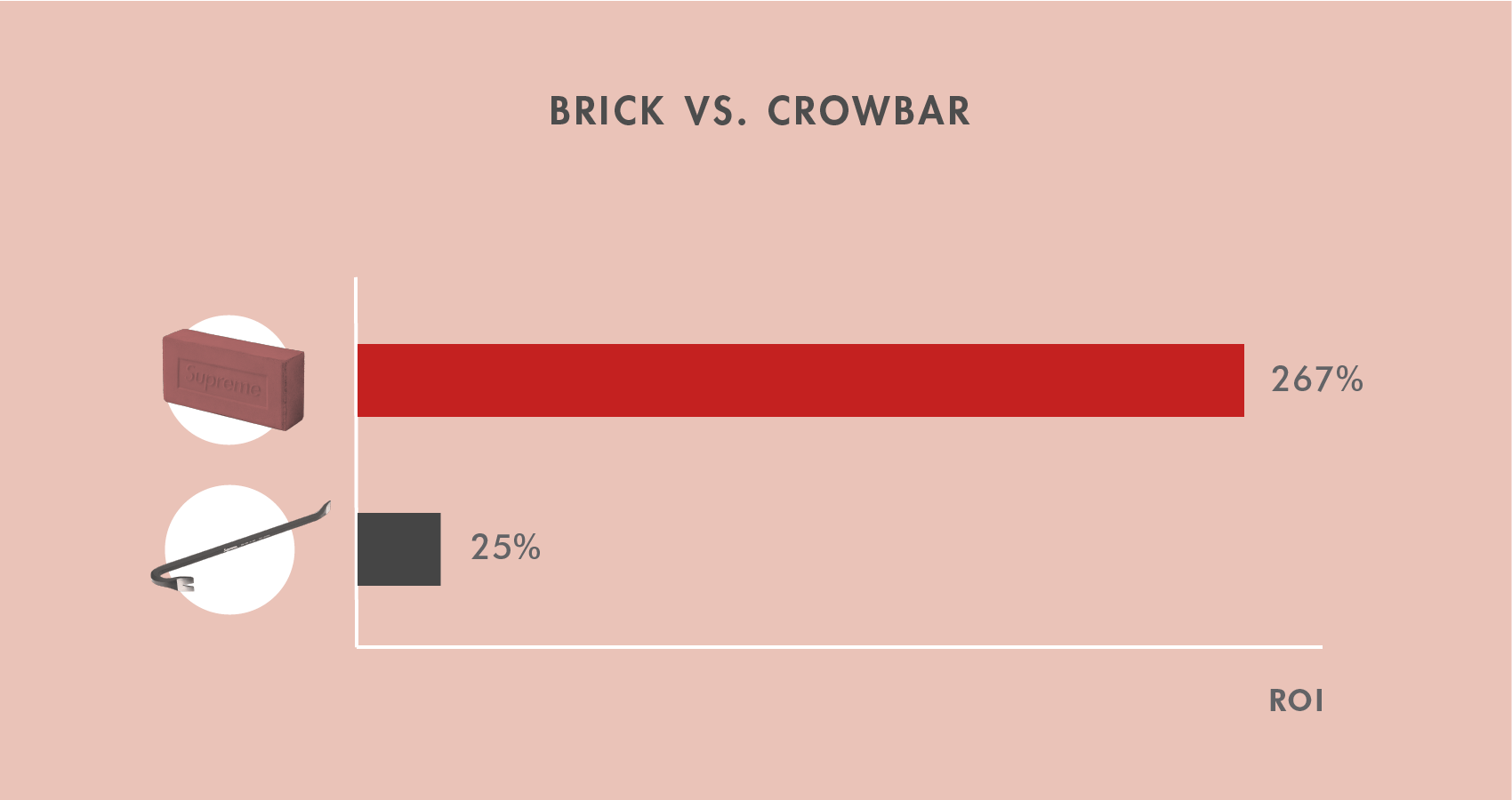 Rule 5: Even if you follow these rules completely, there will be surprises. Why is a motorcycle helmet listed for $2,000 at Stadium Goods, our favorite reselling store? Why did a brick—which seems to break several of the cardinal rules of Supreme investment—become a better investment than a crowbar? Because the world is not fully predictable. A world ruled in part by teens, even less so.