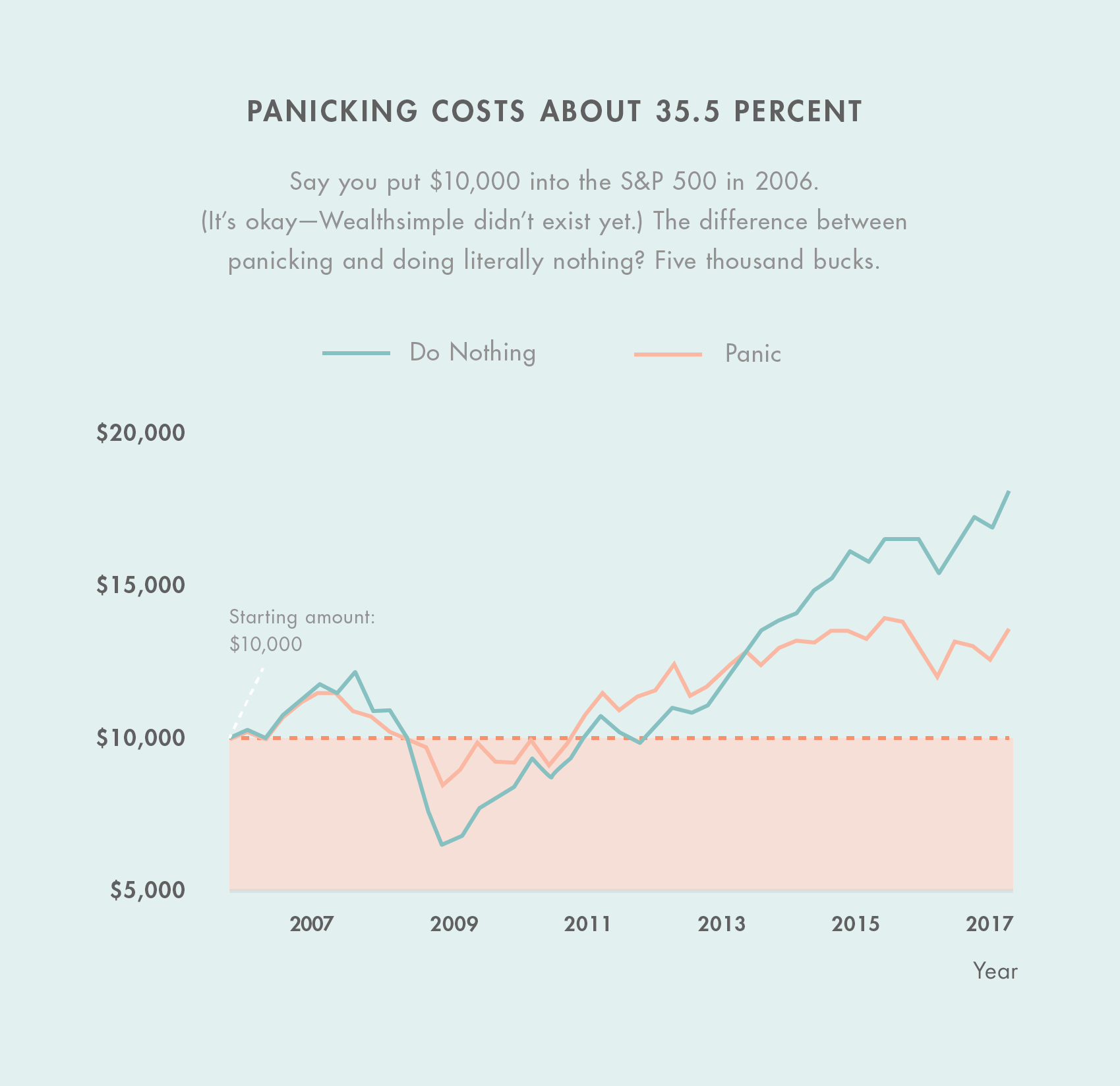 Don’t believe us? The below chart shows what would happen if you’d invested using one of two scenarios. (We made the chart back in 2017, but what it illustrates is still relevant, so stick with us.) In the first, you do nothing. In the second, you employ what’s been called a panic-selling strategy — sell everything when the market drops more than 2% in a day, and then buy back 20 days later if things are looking flat or better. It turns out the guy who lost the password to his brokerage account would have done better. By a lot. And that’s not including transaction fees.