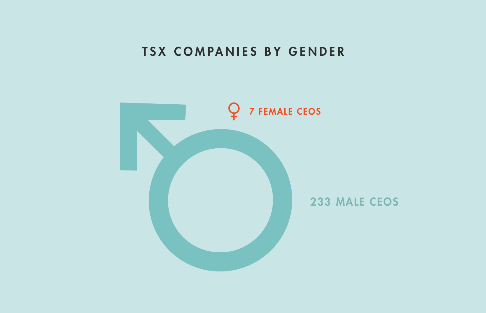 The TSX index isn't doing well putting women in leadership roles. Among the 240 companies that comprise the Index, only seven of them have female CEOs: Dream Global Real Estate Investment Trust, TransAlta Corporation, Just Energy Group, Dundee Real Estate Investment Trust, ATCO Ltd., Linamar Corporation, and Canadian Utilities Ltd. That represents just under 3% of the Index.