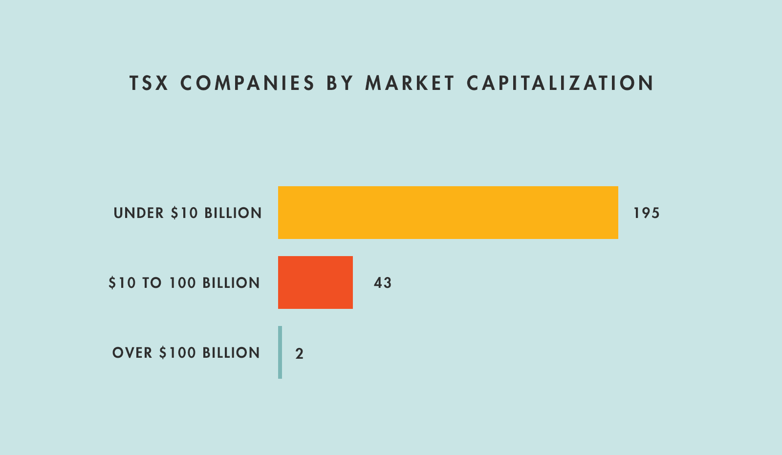 The largest market capitalization in the TSX Index is $107 billion CAD (Royal Bank of Canada), but the vast majority of the firms that make up the Index are far smaller than that: 89% of companies in the Index have market capitalizations below $20 billion CAD, and 97% (233 out of 240 companies) are below $50 billion CAD.