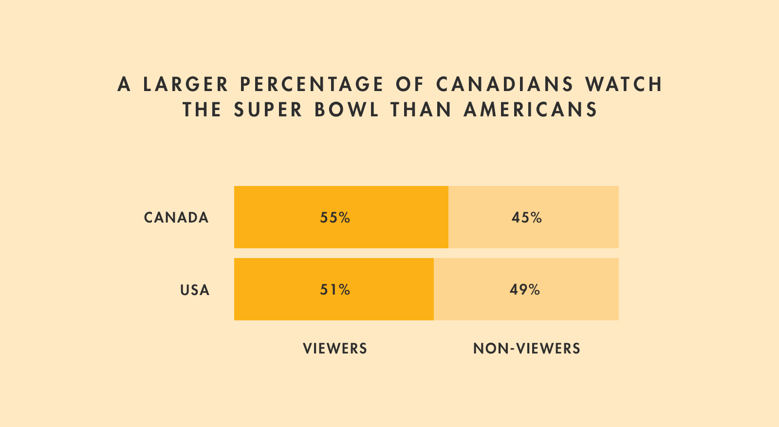 Now, that’s a lot of money. And, you might be saying, there are fewer people in Canada. Not to mention that those people may not be as interested in the Super Bowl. Well, it turns out that a higher percentage of Canadians watched the Super Bowl last year than Americans: 51 percent in the U.S. and 55 percent here.