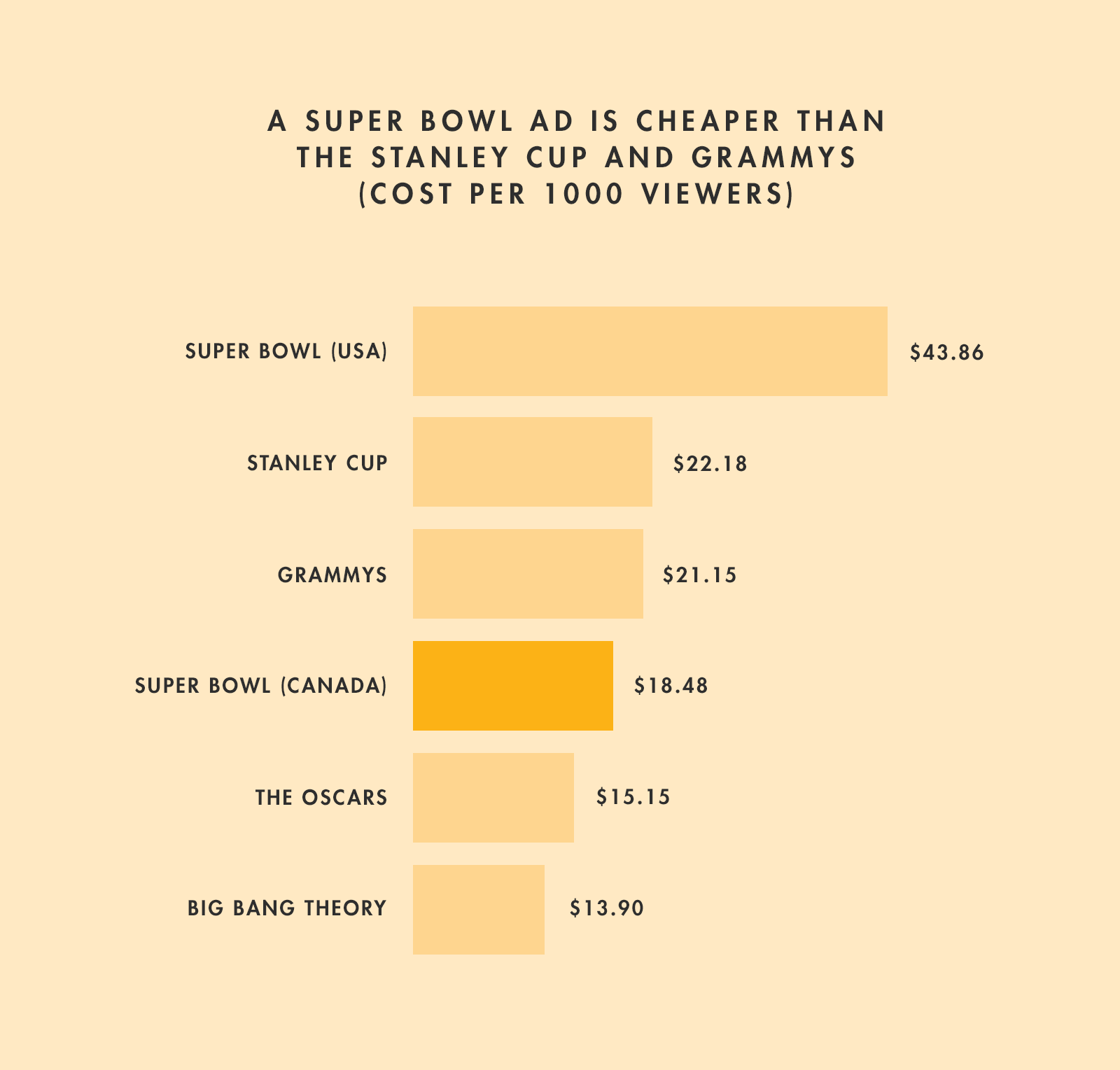 OK, so now we were interested. Still, we wondered: Is advertising just cheaper in Canada? Are advertisers still paying a premium to say they had a Super Bowl ad instead of an ad that reached the same number of viewers for a less high-profile event? Not really. Super Bowl ads are cheap compared to other TV events.