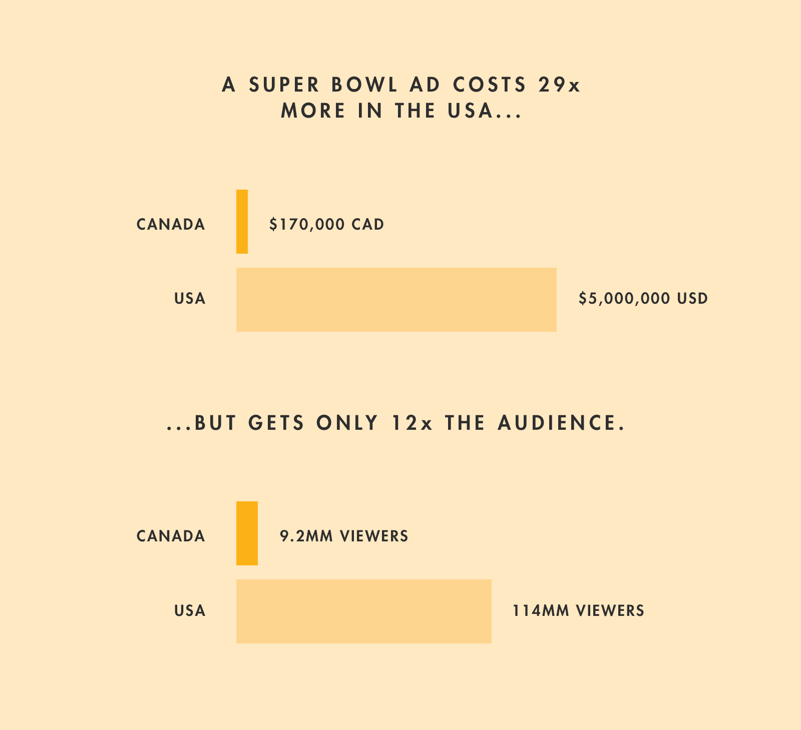 In Canada your $170,000 (CAD) ad will have a cost per thousand viewers of $18.48 — that’s 58 percent less than the USA. You get 2.4x as many viewers in Canada for every dollar spent. That’s literally more than twice the bang for your buck. (By the way, the number of Canadians who watch the Super Bowl — 9,200,000 people — is almost twice the viewership of the Stanley Cup!)