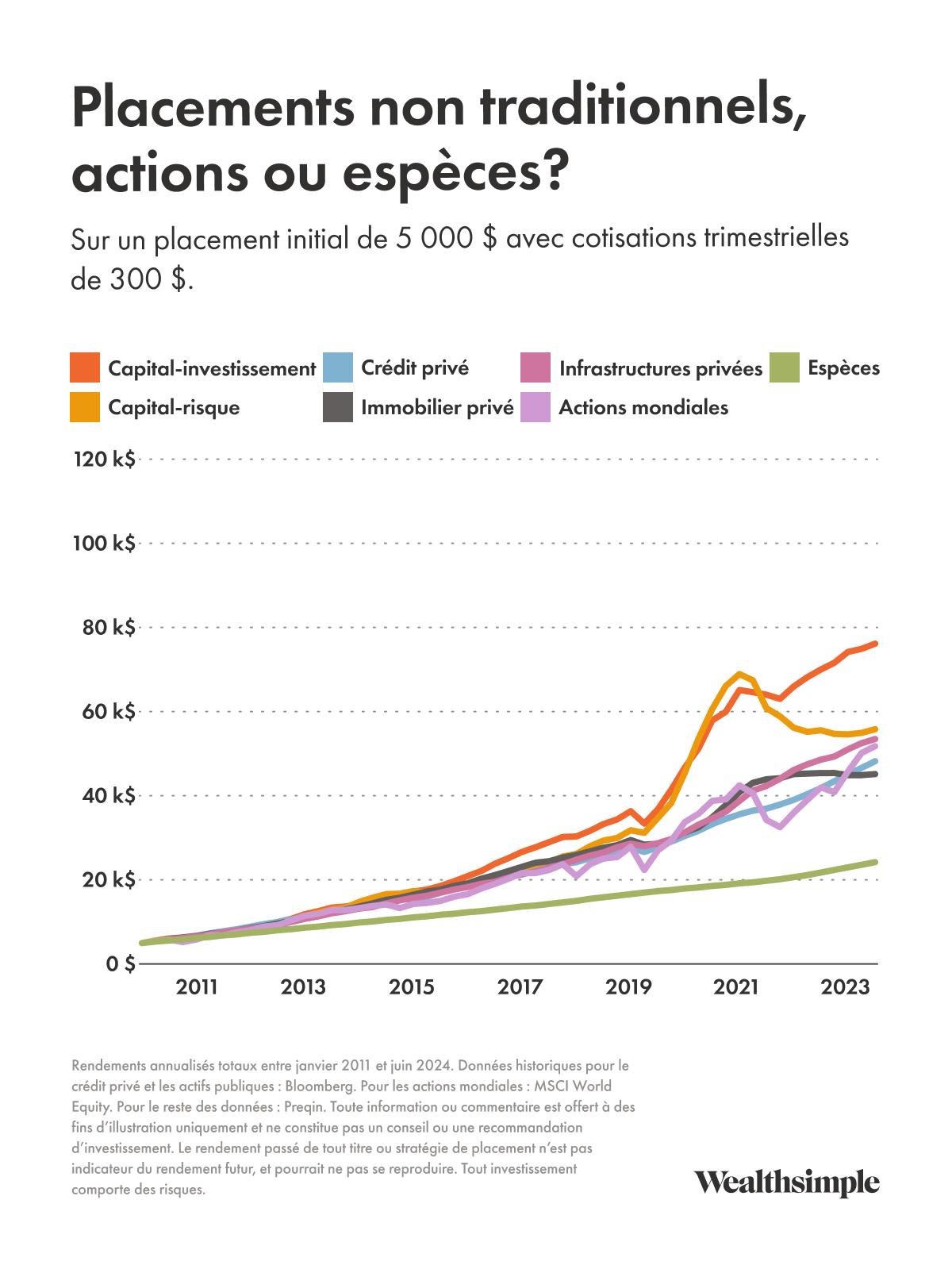 L’un des avantages des placements non traditionnels, c’est qu’ils peuvent offrir des rendements supérieurs aux actions mondiales et aux liquidités. Voici un graphique qui compare les trois types d’investissements entre janvier 2011 et juin 2024.