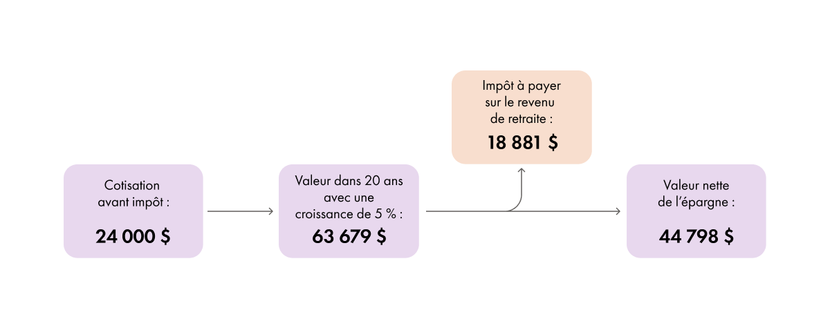 Examinons maintenant les revenus générés par une année d’épargne. A verse le maximum autorisé dans son REER, soit 24 000 $ – 18 % de ses gains annuels de 134 000 $. Ce placement génère 5 % d’intérêts par an pendant 20 ans. (Pour simplifier, disons que B ne verse pas de cotisations à un REER.) À la retraite, sa cotisation initiale de 24 000 $ atteindra une valeur de 63 679 $. A devra alors payer 18 881 $ d’impôts au moment de retirer cette somme, ce qui lui laissera 44 798 $.