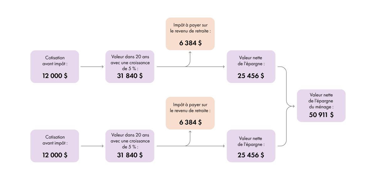 Imaginons un couple de deux personnes. A gagne 134 000 $ par année, avec un taux d’imposition marginal de 43,41 %, qui devrait diminuer à 29,65 % à la retraite. B gagne 40 000 $ par année et paie un taux marginal de 20,05 %, qui devrait être le même à la retraite.