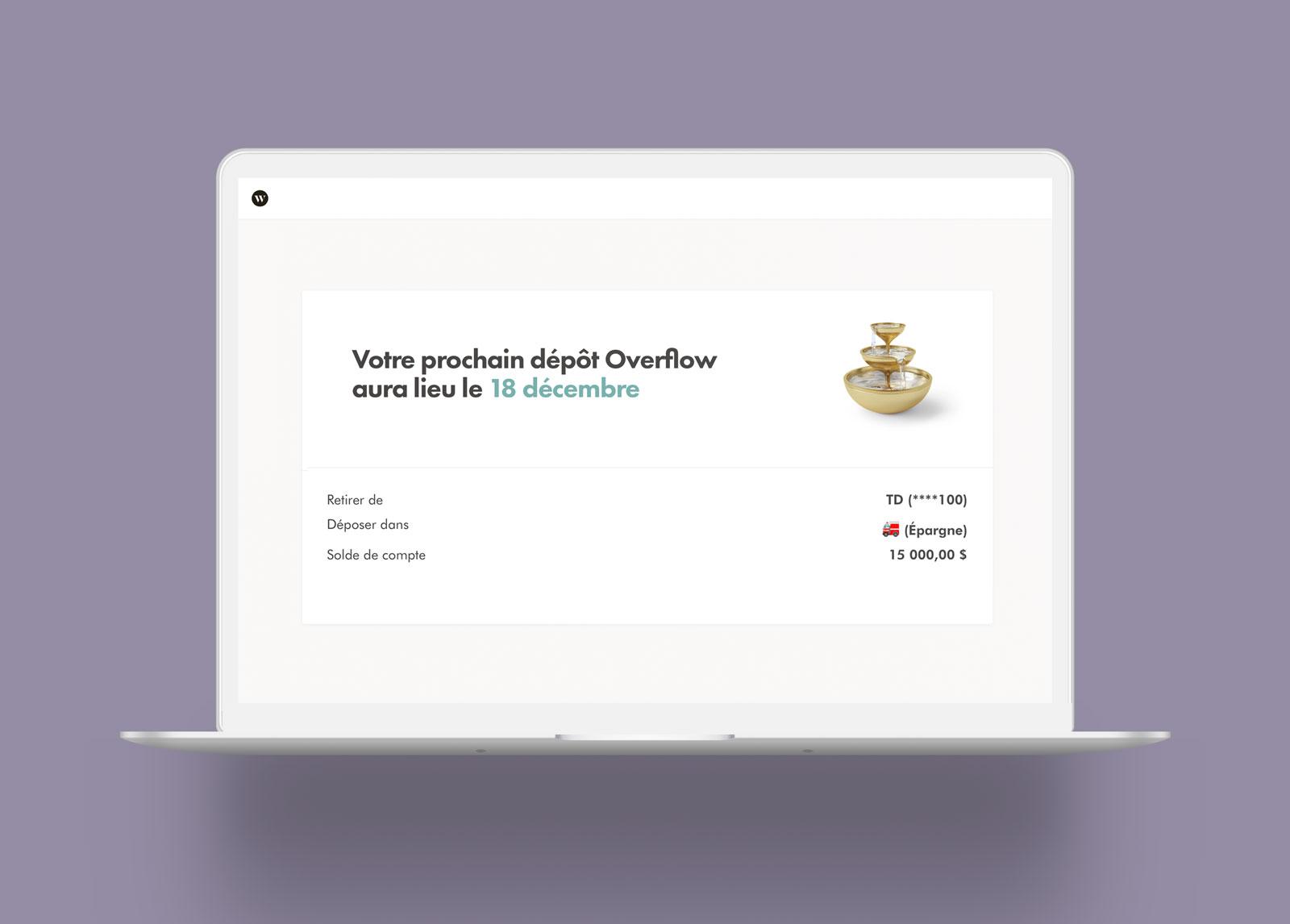 Les dépôts automatiques et Overflow fonctionnent différemment, mais poursuivent le même but. Ils sont complémentaires. Au lieu de retirer le même montant chaque fois, Overflow s’adapte à vos dépenses et revenus, qui peuvent changer d’une semaine à l'autre ou d’un mois à l’autre — spécialement pour ceux d’entre nous qui ne reçoivent plus le classique chèque de paie aux deux semaines.