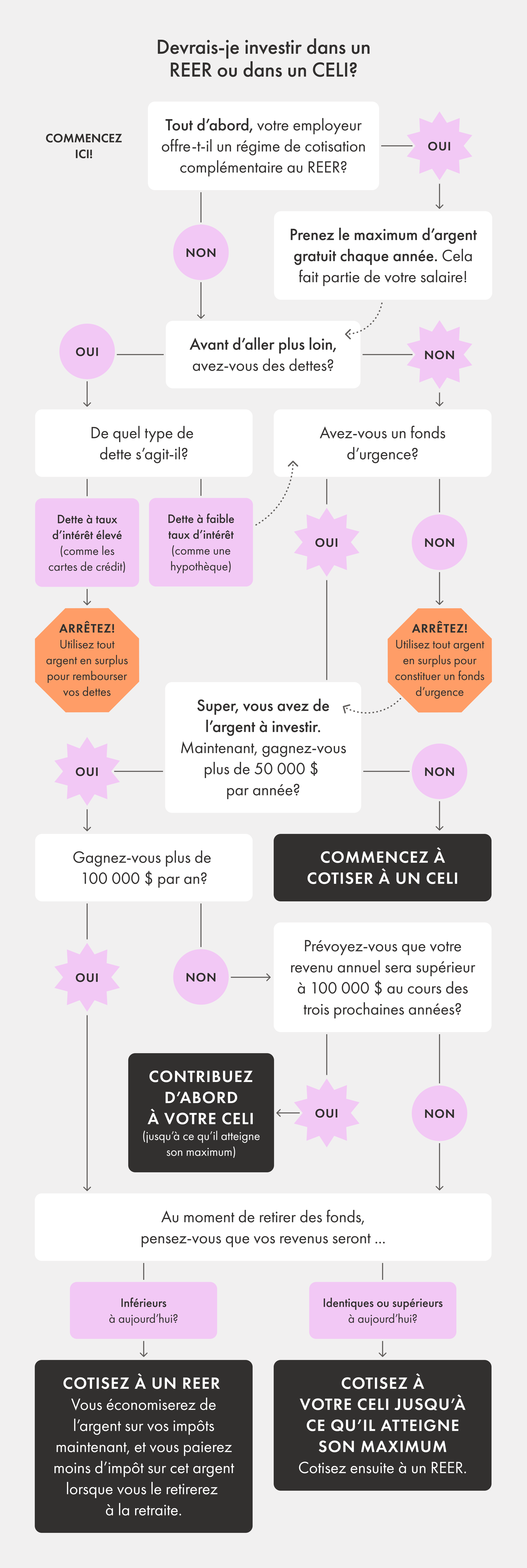 Quel que soit votre salaire, si votre employeur offre un REER avec cotisations complémentaires, la première chose à faire est d’investir le montant maximal que votre employeur versera avant de vous tourner vers un CELI. « Le premier endroit où vous devriez commencer à investir, c’est dans votre régime complémentaire de retraite, si vous en avez un. » dit Wolpert.
